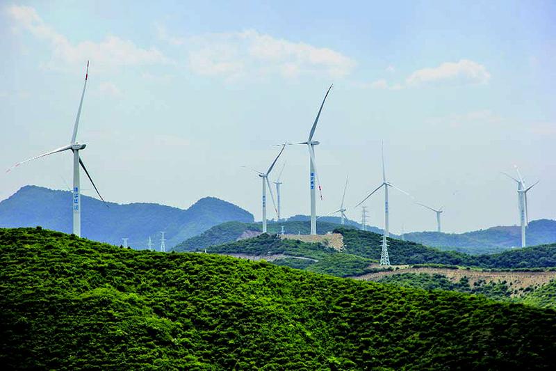 7月10日,蜿蜒起伏的云梦山迎来了盛夏里最美好的时光。刚下过一场雨的山中水雾氤氲,满目郁郁葱葱,五颜六色的野花随风摇曳。从云梦山顶俯瞰,一座座80多米高的“大风车”擎天而立,形成了一个巨大的绿色发电厂,白色的三扇风机叶片不紧不慢地旋转,不仅为这片风光旖旎的山头锦上添花,也使源源不断的风能转化为电能,成为绿色新能源的宝库。