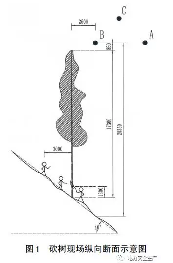15时50分,刘某某和颜某某负责轮流砍树,曹某在旁边监护观察。由于树梢向导线外侧弯曲,且地势位于斜坡(约40度),现场人员错误判断桉树不会倒向导线侧,故未采取用绳索控制桉树倒向的安全措施。16时04分,正在砍伐的桉树倒向线路侧(见图2、图3),同时导线对桉树放电并发出爆炸声(500kV惠茅乙线跳闸,重合成功,再次跳闸不重合),刘某某被电弧轻度灼伤,正拿刀砍树的颜某某身上着火,曹某见状立即脱下工作服,扑灭颜某某身上火苗。16时05分,曹某电话报告罗某某;罗某某立即拨打120、