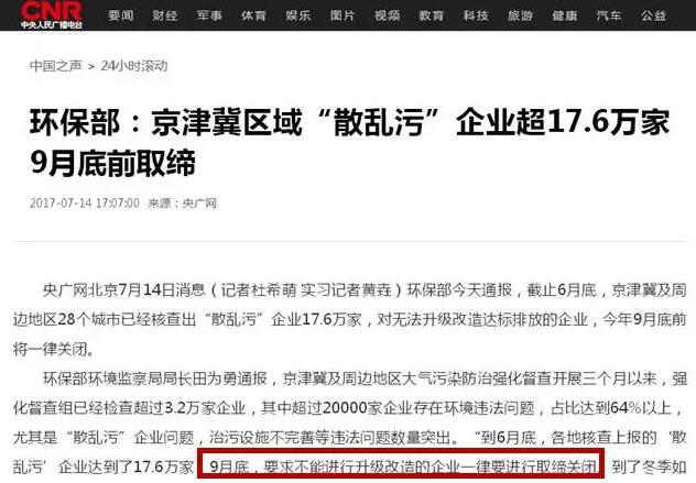 据央广网、上海证券报消息,环保部7月14日通报,截止6月底,京津冀及周边地区28个城市已经核查出“散乱污”企业17.6万家,对无法升级改造达标排放的企业,今年9月底前将一律关闭。