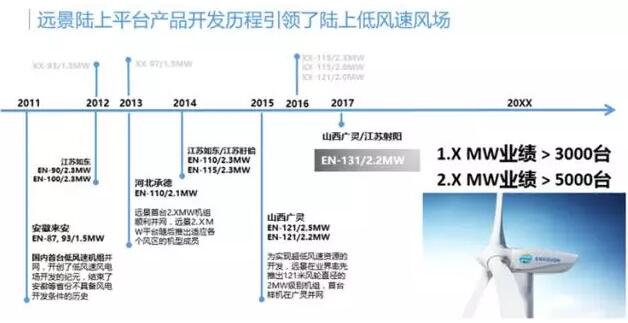 2013年,EN-110/2.1MW机组在河北承德风场投运,这款机型出自远景2.XMW机组平台,引领全球2MW机组走向低风速时代。