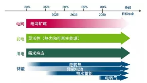 反观另一个新能源发展大国德国,2016年可再生能源发电量占比已经超过了32%,在某些日子里可再生能源甚至能够覆盖约90%的电力消耗。在如此高的可再生能源比例下,整个电力系统的灵活性也亟待提高。根据德国联邦环境部的分析,为了消纳电网越来越多的波动性,需要提高以下四个领域的灵活性: