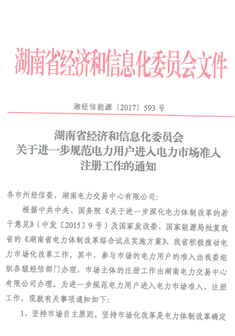 根据中共中央、国务院《关于进一步深化电力体制改革的若干意见》(中发[2015]9号)及国家发改委、国家能源局批复我省的《湖南省电力体制改革综合试点实施方案》,我省积极推动电力市场化改革工作。其中,参与市场的电力用户的准入由我委组织各级经信部门办理,市场主体的注册工作由湖南电力交易中心有限公司办理。为进一步规范电力用户进入电力市场准入、注册工作,现就有关事项通知如下: