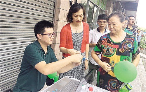 工作人员向社区居民发放IC卡。