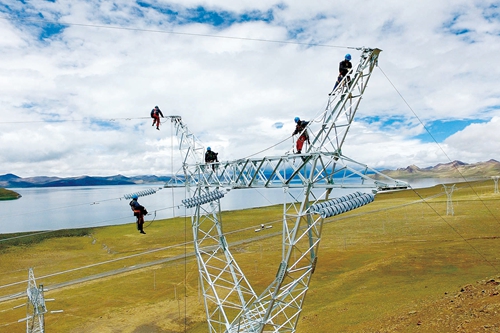 8月27日,在海拔5200多米高的西藏自治区山南市浪卡子县打隆镇境内,110千伏洛扎II回输变电工程浪卡子标段输电线完成施放,为确保今年9月30日并网送电奠定了基础。图为国网安徽省电力公司和湖北省送变电工程公司施工人员正在进行放线作业
