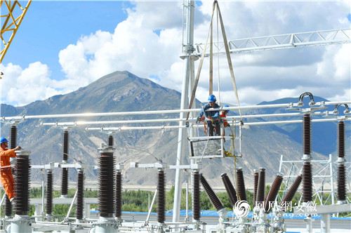 2017年8月30日,在西藏自治区山南市扎囊县,国网安徽省电力公司援建工人正在安装主变压器接线。当日,西藏自治区山南市扎囊县110千伏变电站已基本竣工,土建和电气施工班组作业在做最后冲刺,这也是该县首座110千伏变电站,并建设在海拔3540米上。目前,该变电站总体进度可控,土建和电气安装均完成98%以上,调试工作完成进度超过95%,并计划于2017年9月初具备全站送电条件。该工程建成后不仅可增强西藏主电网与地方小水电互联互通的能力,最大限度地提高了西藏电网的资源优化配置能力,还可满足山南市扎囊、贡嘎县持续增长的用电需求,为当地经济发展和藏牧民生产生活提供强有力的电力保障。