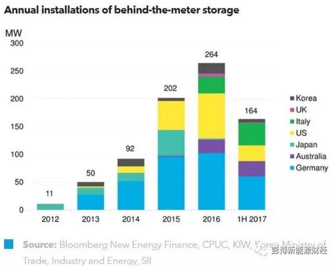 在政策补贴机制下,根据彭博新能源财经数据统计,从2009到2017年上半年,全球居民和工商业储能系统的装机量达783MW。目前来看,全球规模对储能系统的政策支持最集中的国家分别是美国加州、德国和日本。