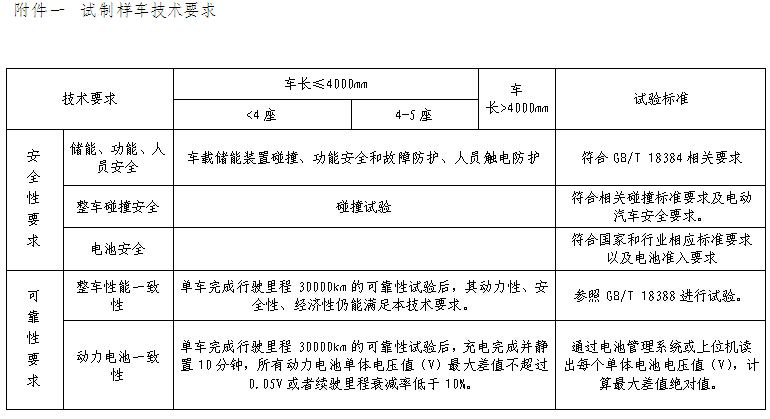 试制的纯电动乘用车样车数量不少于15辆。提供检测的样车经过国家认定的检测机构检验,符合现行汽车标准,并在安全性、可靠性、动力性、整车轻量化、经济性等方面达到规定的技术要求(详见附件一)。