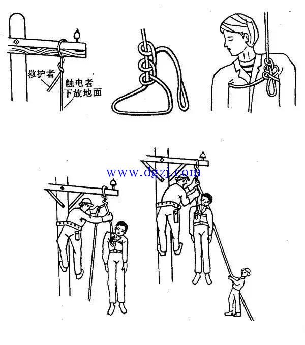(4)下放前,先检查绳索扣结、支架是否牢固。解开安全带时不要弄错。防止自己或触电者从高空坠落。