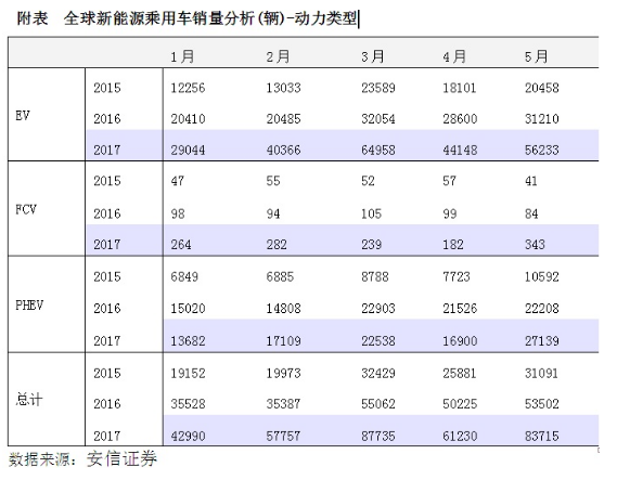 今年1-5月全球新能源乘用车总销量为33.34万辆,相比去年的22.97万辆增长了45.15%,比2016年与2015年同期(总销量为12.85万辆)的78.75%的增长幅度有所回落。在今年33.34万辆的销量中,中国、日本和美国分别销售了11.6万辆、7.12万辆和6.82万辆,占据全球新能源车销量前三位置,分别同比增长了34.9%、37.19和20.45%。