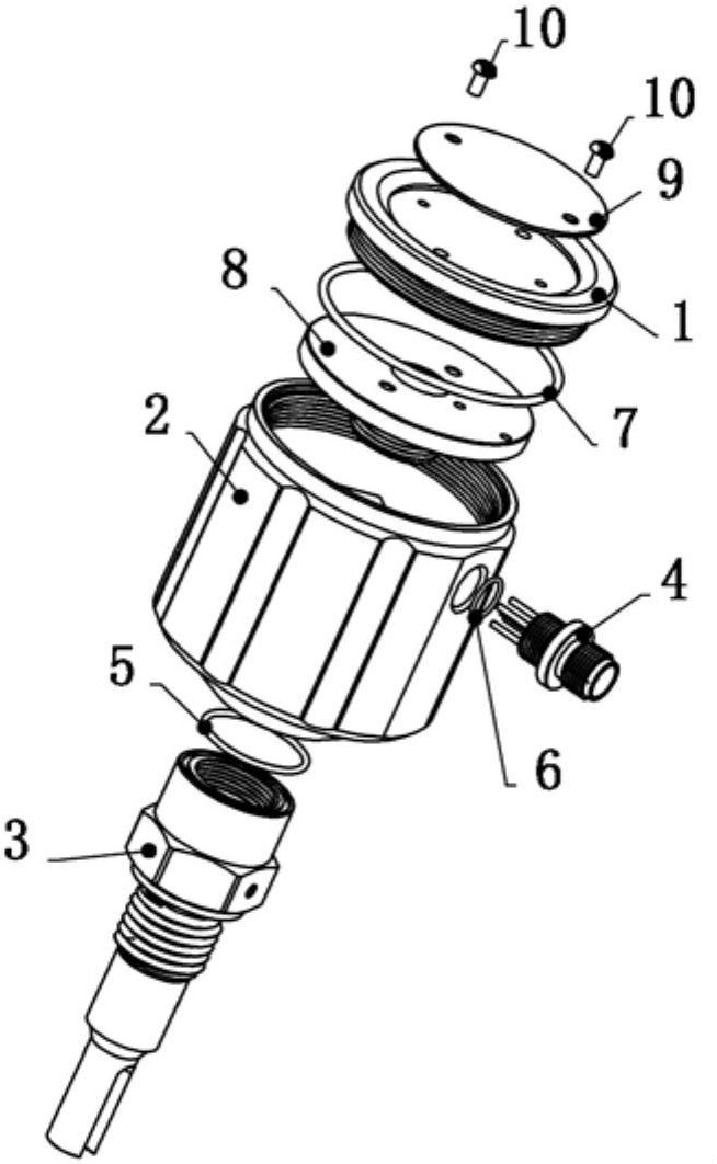 作为上述技术方案的改进:所述传感器探头设置有螺纹,以便于安装与维护。所述传感器探头设置有锁紧块,以用于在所述传感器探头与所述仪表壳体连接时以固定传感器探头。所述传感器探头(3)与锁紧块(8)之间设置有一第一密封圈(5),以便于所述传感器探头(3)与锁紧块(8)连接时对其进行密封。所述仪表壳体设置有开孔。所述开孔配置为与航空快速接头匹配,以便于安装航空快速接头。所述开孔设置有第二密封圈,以便于所述仪表壳体与所述航空快速接头连接时对其密封。设置有第三密封圈,以用于在所述后盖与仪表壳体连接时对其进行密封。所述后盖上方设置有铭牌,以标识型号信息。设置有多个螺丝,以将所述铭牌固定至后盖上。