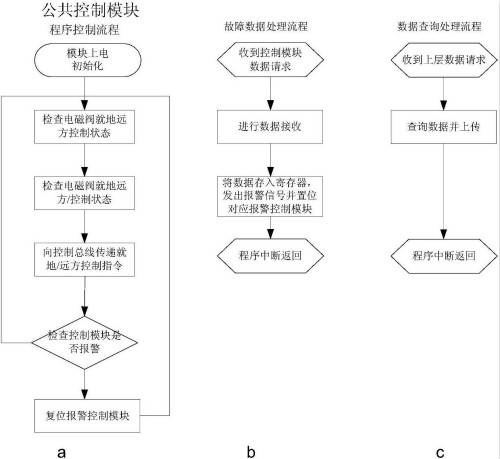 前述公共控制模块,通过底板将指令发给各电磁阀控制模块,公共控制模块预留远方及故障信号反馈接口,便于控制室监控阀门操作模式及操作。同时,本公共控制模块设计数据采集接口与底板相连,通过底板采集各电磁阀控制模块的状态信号,如电磁阀的指令与状态不匹配时会报故障信号、电磁阀控制模块故障时也会报出故障信号等。此外,本公共控制模块还设计数据上传接口,通过此接口可采集到所有电磁阀控制模块的状态信号。