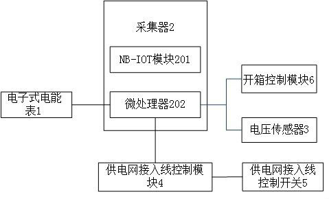 与现有技术相比,本实用新型技术方案的优点有:1、采用NB-IOT模块代替传统的WIFI或ZigBee ,传输距离远,能耗低,穿墙能力强;2、可以测量电压,提供电压调控的依据,方便在电压偏高或偏低区域调整供电电压;3、可以检测电能表箱门是否被非法打开,并将箱门被非法打开情况通知供电部门,防止窃电;4、具有可控制供电网接入线控制开关,供电部门可以根据用户付费情况,远程断开或接通开关。