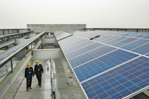 供电员工检查绿色能源网屋顶光伏发电设备。 孙正龙 摄