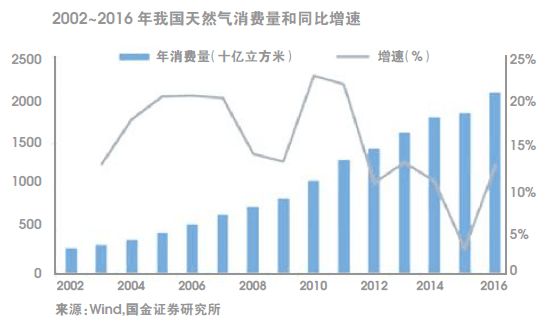 天然气在经历了十余年的黄金时代(2002~2013年,年均消费增速16%)后,增速出现放缓的情况,2014~2015年宏观经济放缓叠加替代能源价格下跌,促使天然气消费增速一度降至3%的低点。政策推动和气价比改善,推动了天然气消费需求的快速增长。截至2017年7月,我国累计天然气消费量达到1323亿立方米,同比增速达16.2%。