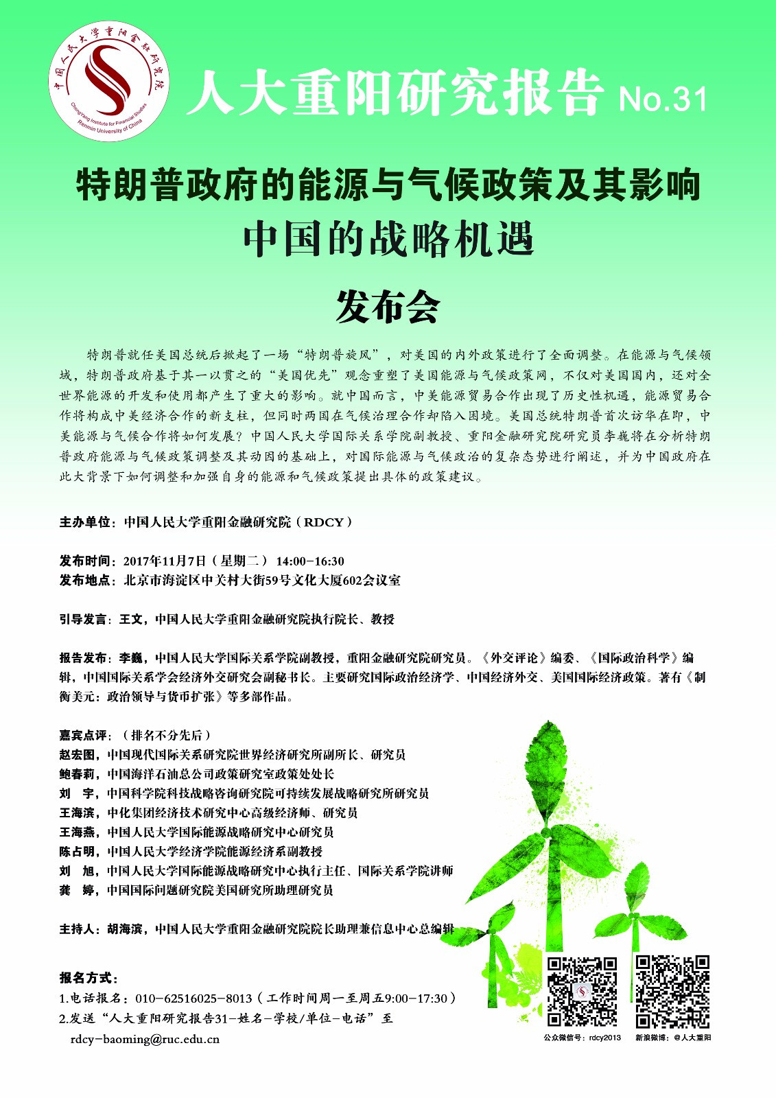 原标题:【预告】研究报告发布:特朗普访华在即,中美能源与气候合作将如何发展? 人大重阳研究报告第31期 《特朗普政府的能源与气候政策及其影响:中国的历史机遇》发布会 特朗普就任美国总统后掀起了一场“特朗普旋风”,对美国的内外政策进行了全面调整。在能源与气候领域,特朗普政府基于其一以贯之的“美国优先”观念重塑了美国能源与气候政策网,不仅对美国国内,还对全世界能源的开发和使用都产生了重大的影响
