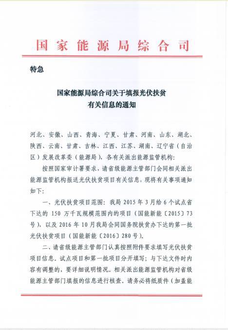 2017年11月9日,国家能源局综合司印发了《关于填报光伏扶贫有关信息的通知》,要求开展光伏扶贫的试点省份和拥有第一批光伏扶贫项目的省份按要求填写光伏扶贫项目信息,并于11月15日前上报。
