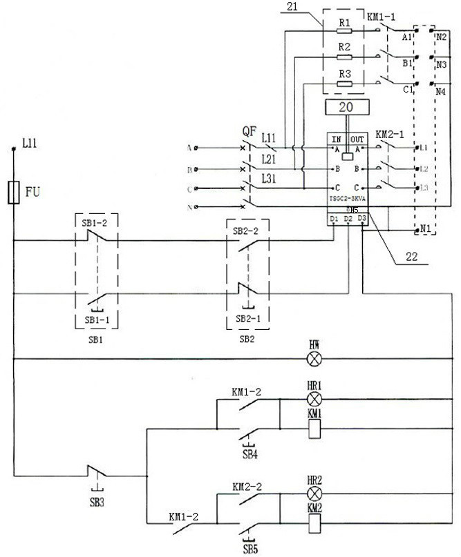 所述第一点动按钮的第一触点经所述第二点动按钮的第一触点连接至所述调压器的第二端口,所述第一点动按钮的第二触点经第二点动按钮的第二触点连接至所述调压器的第一端口,所述调压器的第三端口连接至所述调压器的零线接线端;从所述熔断器还引出导线连接至所述第三点动按钮的一端,所述第三点动按钮的另一端分为两路,第一路连接至并联的第四点动按钮和第一接触器辅助触点;上述并联电路与并联的第一接触器线圈和第一红色指示灯相串联后引出导线连接至所述调压器的零线接线端;第二路经第一接触器辅助触点连接至并联的第五点动按钮和第二接触器辅助触点;上述并联电路与并联的第二接触器线圈和第二红色指示灯相串联后引出导线连接至所述调压器的零线接线端。