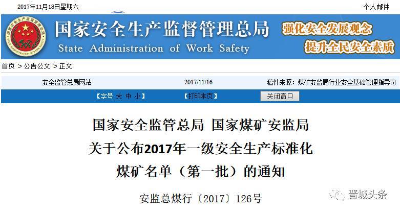 原标题:【通知】晋城这4家煤矿摊上大事了!刚刚被安监总局点名…… 按照《煤矿安全生产标准化考核定级办法(试行)》 经资料审查、现场检查、网上公示 确认61处煤矿为一级安全生产标准化煤矿 自公布之日起有效期3年 咱晋城有4座煤矿成功入选 一起来看一下吧! ↘↘↘ 根据国家安全监管总局、国家煤矿安监局、国家发展改革委、国家能源局联合印发的《关于大力推进煤矿安全生产标准化建设工作的通知》(安监总煤行〔2017〕59号)和《关于明确煤炭产能置换和生产能力核定工作中有关事项的通知》(发改办运