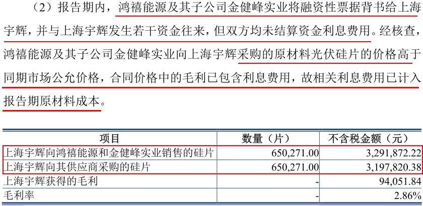 但它和子公司金健峰一道向宇辉采购原材料——光伏硅片,且价格高于同期市场公允价格,这高出来的部分,就是利息费用。