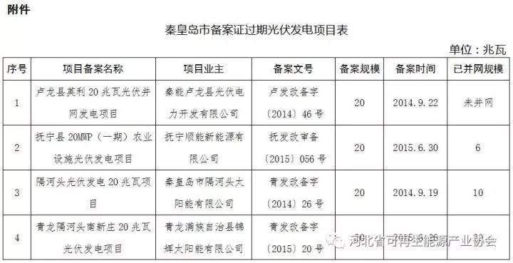 原标题:河北省发改委:关于秦皇岛市、唐山市、保定市、沧州市光伏发电项目备案证有关情况的复函 秦皇岛市发展改革委: 你委《关于上报一次性报送光伏发电项目备案证过期影响土地、环评、发电许可等手续办理出具意见的请示》(秦发改能源〔2017〕496号)收悉。经研究,现函复如下: 按照河北省能源局《关于一次性报送光伏发电项目备案证过期影响土地、环评、发电许可等手续办理出具意见请示的通知》要求,秦皇岛市共上报光伏发电项目4个、备案规模80兆瓦