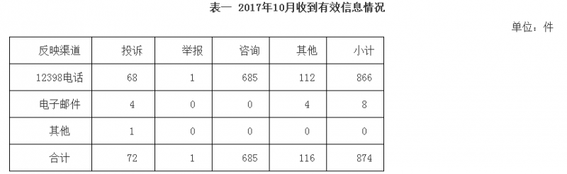 按反映渠道分类,12398电话866件,电子邮件8件。(2017年10月收到有效信息情况见表一)