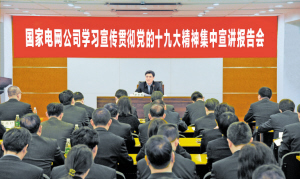 舒印彪在英大传媒集团宣讲党的十九大精神时强调以党的十九大精神为指引凝聚广大干部职工干事创业强大力量 11月20日,党的十九大代表、国家电网公司党组书记、董事长舒印彪赴英大传媒投资集团有限公司,深入宣讲党的十九大精神,强调把学习宣传贯彻党的十九大精神作为首要政治任务,坚决在思想上政治上行动上同以习近平同志为核心的党中央保持高度一致,以党的十九大精神为指引,努力开创各项工作新局面。要求公司新闻宣传战线要宣传好党的十九大精神,充分展现公司在服务党和国家工作大局中的生动实践和突出成就