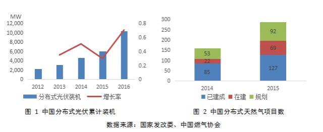 从中国的视角来看,随着中国经济发展进入“新常态”,中国能源行业发展的根本目标已是天壤之别。过去,中国经济持续的高速增长导致能源供应短缺,那时的时代主线是扩大能源生产以保障供应;如今,经济发展放缓,能源供给能力已远超需求,反而是技术、环境、价格、效率等问题制约了进一步发展,中国能源发展的问题从数量问题逐渐转为质量问题。短短五年间,中国见证了可再生能源在装机容量方面的爆发式增长。然而,严重的“弃风弃光”问题成为了限制可再生能源进一步发展的瓶颈。分布式能源的特征符合中国下一阶段能源发展“提质增效”的目标,因此分布式能源在中国也显现了迅猛崛起的势头。分布式光伏累计装机从2012年时的2.3GW快速上升至2016年底的10.3GW(如图),年均增长率高达46%;分布式天然气项目数(包括建成、在建、规划)从2014年时的160个增长至2015年底时的288个。