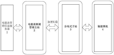 所述的分布式子站与电能表例调管理主站间的数据交换通过加密U盘实现。所述的电能表例调管理主站包括主控制模块、轮换信息接收模块、加密文件生成模块、加密文件输出模块、完工信息接收模块和数据校验模块,所述的主控制模块分别连接轮换信息接收模块和完工信息接收模块,所述的完工信息接收模块分别连接轮换信息接收模块和加密文件输出模块,所述的完工信息接收模块和数据校验模块连接;主控制模块判断当前信息,若为轮换信息,则启动轮换信息接收模块接收当前信息,由加密文件生成模块生成任务包,并通过加密文件输出模块输出给分布式子站;若为完工信息,则启动完工信息接收模块接收当前信息,并通过数据校验模块进行校验,若校验有误时生成报警信息,若校验无误,则将信息上传至电能表营销信息服务器。