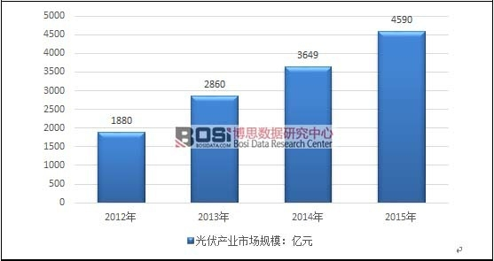 据统计:2014年我国光伏产业市场规模为3649亿元,2015年国内市场规模在4590亿元左右,较上年同期增长25.8%。