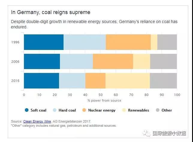 如果看一次能源消费(包括交通、供暖需求),那么2016年煤炭占33.6%、核能6.9%、天然气22.7%、矿物油34.0%、可再生能源12.6%,其他1.8%。