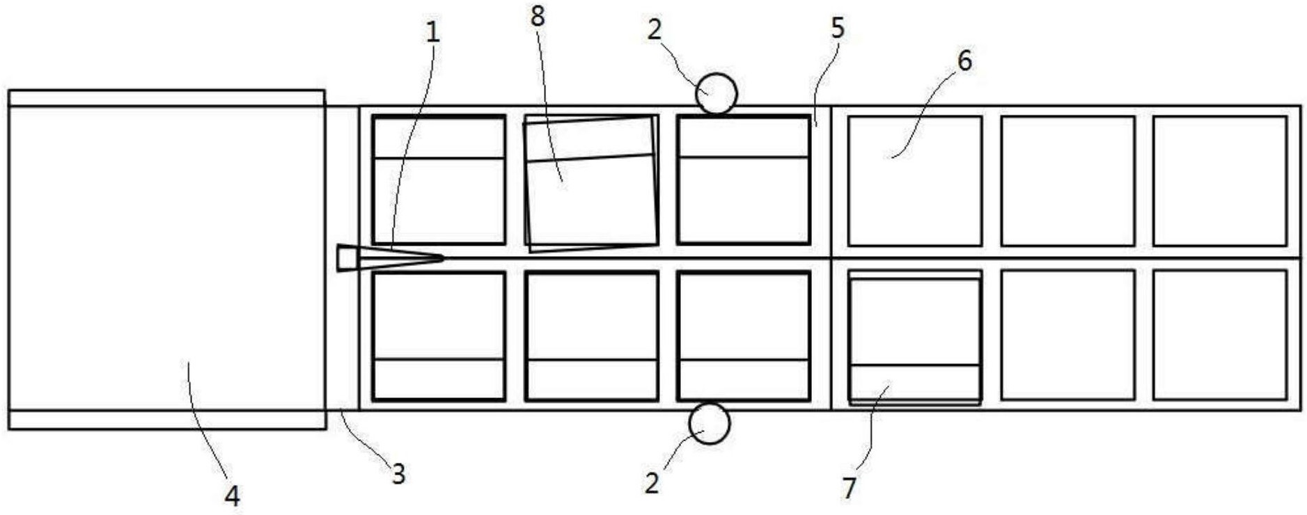 基于现有技术的上述状况,为了解决电能表放置于托盘的不平整问题,本实用新型提供了一种电能表检定位置自动调整装置,使电能表进入检定区域前平整地位于托盘的表槽内,可以大大提高流水线的检定效率。