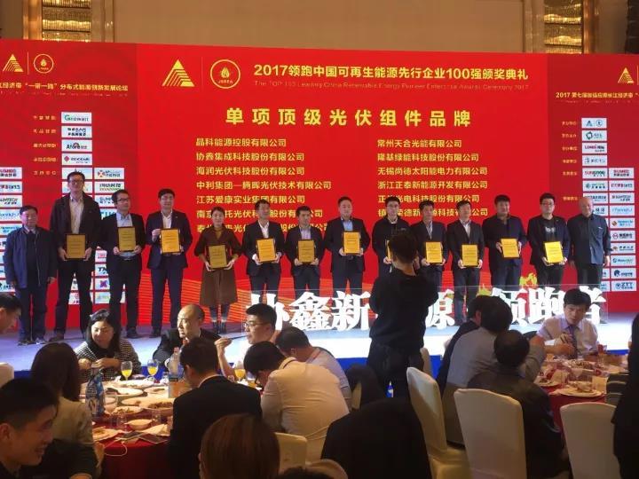 11月24日,2017年领跑中国可再生能源先行企业100强颁奖典礼在南京隆重召开。本次评选活动围绕创新、协调、绿色、开放、共享五大发展理念,着力推进可再生能源领域供给侧结构性改革,激励全国广大可再生能源企业和企业家坚持创新驱动发展战略,加快实现转型升级,不断提升可再生能源企业发展质量和效益。海润光伏以优秀的组件性能,卓越的光伏项目开发能力以及不断创新的企业经营理念,分别荣获“综合多能品牌奖牌”、“单项顶级光伏组件品牌奖牌”、“2017年领跑中国可再生能源先行企业100强 优秀企业家奖杯”三项大奖。