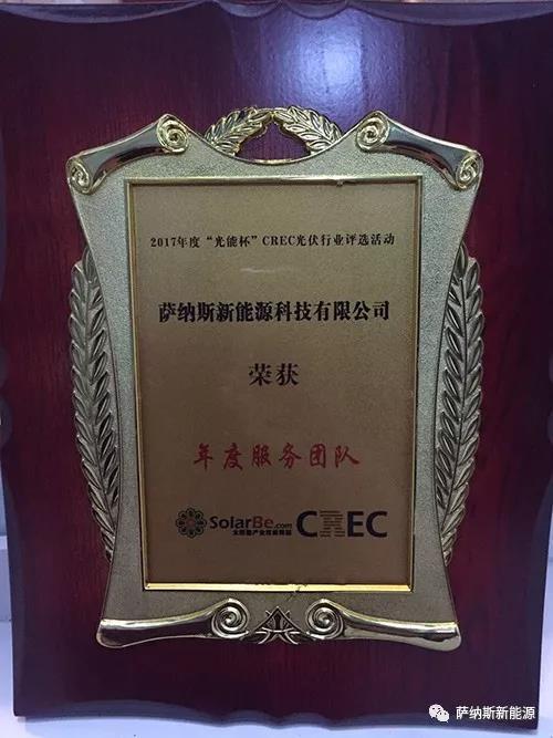2017”光能杯”评选活动于11月1日在"无锡国际新能源大会"开幕首日举行。当晚,光伏产业领域的权威专家、企业领袖、技术精英纷纷亮相评奖盛典,共享这一年度盛会。而参与本次“年度服务团队”评选的萨纳斯新能源科技服务团队凭借在能源互联的趋势下,以智慧大数据平台引领电站技术服务,精细化组串级设备监测全盘掌控电站资产的优异表现,摘得此奖,以负责任的专业态度再次赢得业主及同行业专家的一致票选通过。