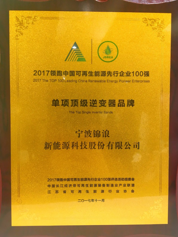 整合分布式能源优质资源,促进产业健康发展, 11月24-25日中国长江经济带可再生能源装备制造业产业联盟联合江苏省可再生能源行业协会在南京召开第七届加强应用长江经济带“一带一路”分布式能源创新发展论坛,锦浪科技与众多企业家代表及来宾共同参与见证了此次行业盛会。论坛同期举办2017年领跑中国可再生能源先行企业100强颁奖活动,锦浪科技荣膺“2017领跑中国可再生能源先行企业100强-单项顶级品牌”奖。