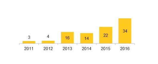 在34GW的总装机量中,中国的新增光伏容量占27GW,增幅远超世界任何其他国家。不过,中国以外的其他发展中国家的光伏装机也出现了强劲增长,印度的新增装机达4.2GW。与此同时,2016年,巴西、智利、约旦、墨西哥、巴基斯坦及其他9个国家的累积光伏容量均增加了1倍以上。总的来说,2016年,光伏在Climatescope研究国家新增发电装机中的比例为19%,较2015年的10.6%和2011年的2%有所提高。