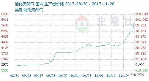 生意社数据显示,11月初,液化天然气国内生产者价格仅为约4200元/吨,而9月初价格仅为不足3000元/吨。也就是说,短短三个月间,液化天然气价格已经翻番,近一个月也已上涨近50%。