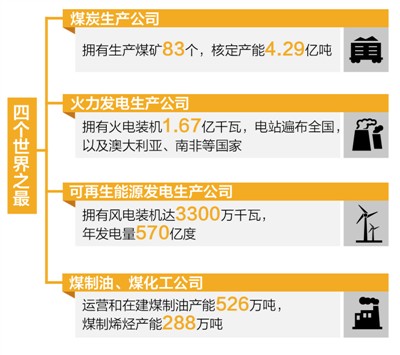 资产规模超过1.8万亿元,拥有33万名员工、8家科研院所、6家科技企业,形成煤炭、常规能源发电、新能源、交通运输、煤化工、产业科技、节能环保、产业金融等8大业务板块……重组后的国家能源集团可谓能源“巨无霸”,按照2016年年底的口径计算,它同时拥有了四个世界之最――