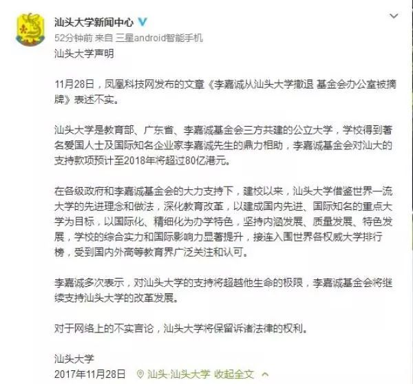 11月28日,李嘉诚基金会向澎湃新闻回应:我们对这个消息感到莫名其妙。李嘉诚基金会按国家2017年对境外慈善机构的注册及办公室的最新规定,把基金会在国内的数个办公室合并搬到深圳。众所周知李先生对汕头大学是超越生命的承诺,更在基金会内特别为汕头大学基金会作独立立项。