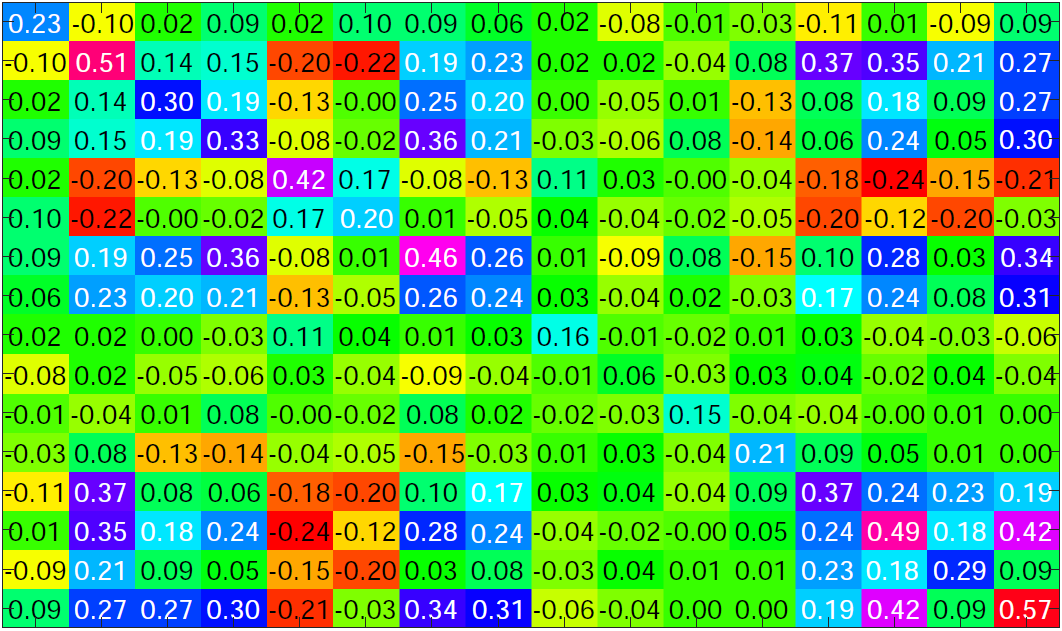 16个用户属性关系图。正值和负值分别表示正相关和负相关。