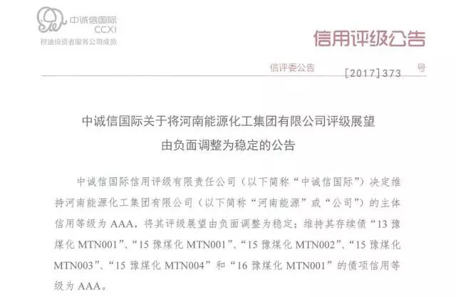 原标题:前三季营收1183亿 净利1.08亿 河南能源主体评级展望调整为稳定 投实消息:11月16日,中诚信国际发布公告,决定维持河南能源化工集团有限公司的主体信用等级为AAA,将其评级展望由负面调整为稳定。维持其存续债“13豫煤化MTN001”、”15豫煤化MTN001”、”15豫煤化MTN002””15豫煤化MTN003””15豫煤化MTN004”和”16豫煤化MTN001”的债项信用等级为AAA