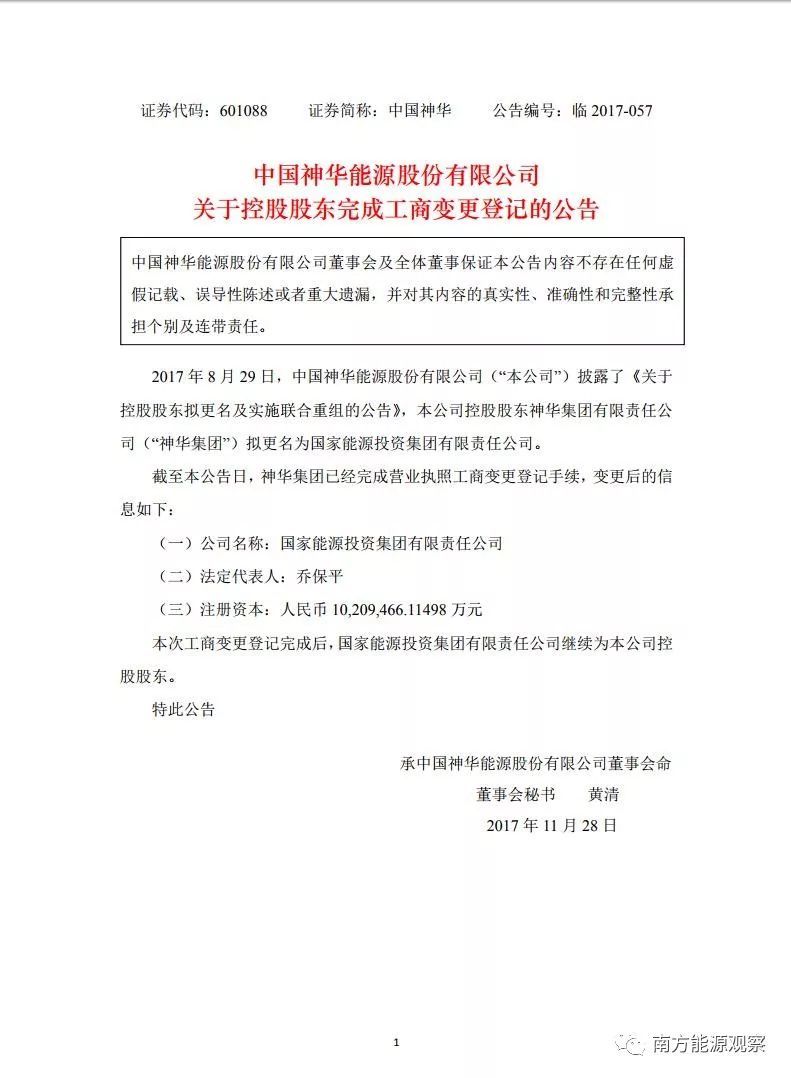 2017年11月28日,中国神华公告称,截至本公告日,神华集团已完成营业执照工商变更登记手续,公司名称为国家能源投资集团有限责任公司,法定代表人为乔保平,注册资本1020.95亿元人民币。工商变更登记完成后,国家能源投资集团有限责任公司继续为本公司控股股东。