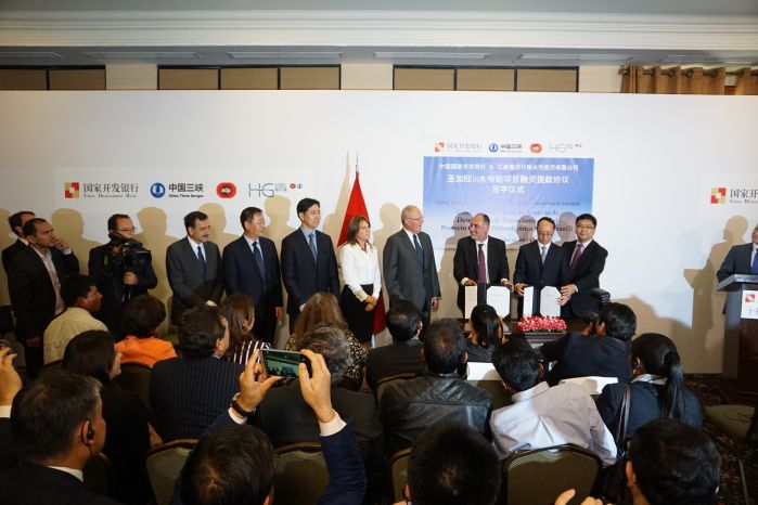 本网讯(何永刚)当地时间11月29日中午,中国三峡集团环球水电公司与国家开发银行关于秘鲁圣加旺Ⅲ水电站项目的融资提款协议签字仪式在利马举行。秘鲁总统库琴斯基出席见证并发表讲话,秘鲁能矿部部长卡耶塔纳、国家开发银行副行长蔡东、中国驻秘鲁大使贾桂德、葡萄牙驻秘鲁大使库迪尼奥、三峡国际能源投资集团有限公司董事长陆国俊以及项目所在地社区代表出席签字仪式并致辞。