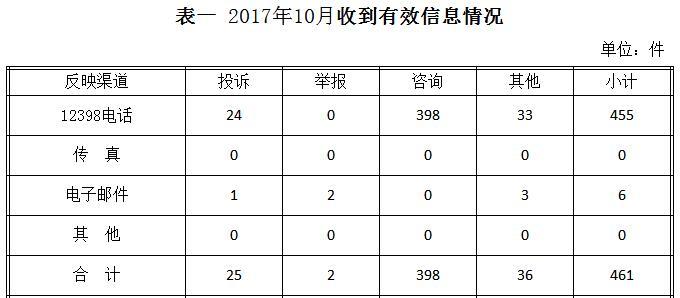 按反映渠道分类,12398电话455件,传真0件,电子邮件6件,其他0件。(2017年10月收到有效信息情况见表一)