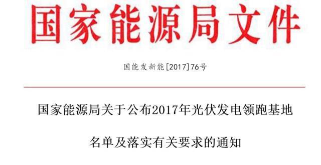 根据《国家能源局关于推进光伏发电“领跑者”计划实施和2017年领跑基地建设有关要求的通知》(国能发新能〔2017〕54号,以下简称《通知》)规定及有关要求,在地方政府自愿申报、省级能源主管部门初审上报的基础上,我局组织开展了2017年光伏发电领跑基地优选工作,现将优选确定的领跑基地名单及基地建设的有关要求通知如下: