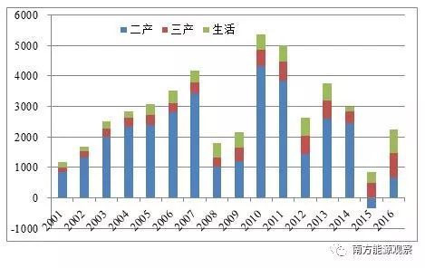 2008年金融危机之后,我国二产用电量增长放缓,波动很大,但三产和生活用电保持稳定增长。其中,2015年二产用电负增长;2016年用电增量2265亿千瓦时,二产、三产、居民生活用电增量分别为666、795、769亿千瓦时,三分天下。