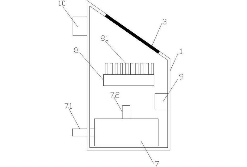 与现有技术相比,本发明的有益效果为:通过检测板检测雨水,当雨水落在检测板上时,检测板的输出端输出低电平信号,而基准电压部输出高电平信号,通过比较部比较,则输出高电平的驱动信号,使得控制部接受驱动信号使得气泵接通电源开始工作,加热板加热保温体内部空气,气泵向检测板送出热风,提高温度的同时,加快检测板附近雨水表面的空气流动速度,使雨水快速蒸发,避免了雨水长时间停留在检测板上,使检测板受到腐蚀或氧化;同时,气泵送出常温空气,避免了直接对检测板进行高温加热造成检测板加速氧化失效的问题。