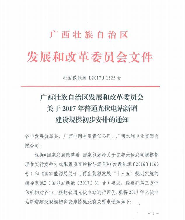 国家能源局给了广西省2017年500MW的地面光伏电站指标。