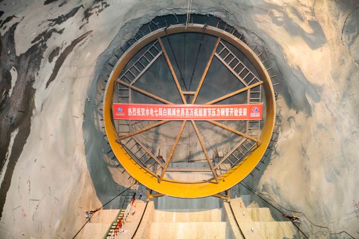 本网讯(杜健伟 赵爽)11月30日,白鹤滩水电站世界首台百万机组首节压力钢管安装开工仪式在左岸压力钢管下平段2号施工支洞举行。经过近2个月精心准备,左岸首节压力钢管已安全运转到位,厂房引水隧洞将由土建开挖阶段转入金属结构安装阶段