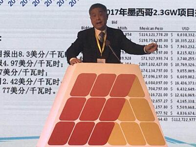 按照会议议程我来给大家做个汇报,简单介绍下背景,我要讲的是全球的趋势,作为企业家来讲,考虑光伏产业的发展,首先要分析的应该是大势,就像下围棋一样,要看大势,大势怎么样,未来长期会怎么样?全球的大势所趋必须是发展可再生能源,可再生能源里最重要的要数光伏。目前在经济方面离不开三个主题,几乎已经成为全球共识,“巴黎协定”现在有176个国家已经有发展绿色能源的政策目标,制定上网电价的有100多个国家。等等一系列数据反映了一个问题,就是发展光伏已经成为全球多数国家的国家意志,这已经是一种大势所趋的发展潮流,不可逆转,事实也证明了这一点。我们国家用电量的需求和GDP弹性系数在1左右,换而言之就是GDP增长6%,用电量也增长6%,电能不能大容量储存,就形成了一个很大的发展空间,需要发展,就要装机,但是国家现在控煤,大力发展非水可再生能源,这就给光伏创造了很好的市场前景。这个市场空间光伏能不能占得呢?十年时间光伏降了90%的价,光伏在世界范围内的招标已经低至1毛1了,过去光伏是只有钱人玩得起的,随着降价速度的加快,越来越多的国家可以参与进来了,使光伏大规模推广变为可能。
