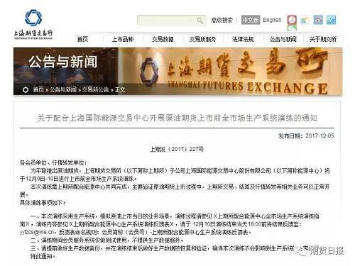 12月5日晚间,上海期货交易所发布通知称,为平稳推出原油期货,上期所子公司上海国际能源交易中心股份有限公司(下称上海国际能源交易中心)将于12月9日-10日进行上市前全市场生产系统演练,主要验证原油期货上市过程中,上期所的交易、结算及行情转发等相关业务可以正常开展。